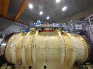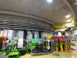 先日、重粒子線治療装置を見てきました。重粒子線治療装置とは放射線治療装置の一種で重粒子線を腫瘍に照射して治療するものです。放射線治療装置はエックス線やガンマ線を用いるものが普及しておりますが、この重粒子線治療装置は炭素イオンを光速の80%まで加速した重粒子線を用います。水素原子よりも重い炭素原子を使うことから重粒子線と呼ばれております。上記画像は重粒子線治療装置の一部を構成する回転ガントリと呼ばれるものです。直径11m、全長13mの巨大な円筒形の構造物です。この回転ガントリの内部に患者が配置され、患者の周囲を回転ガントリが回転することで、様々な方向から腫瘍に粒子線を照射することができます。以前仕事で関わっていたこともあり、回転ガントリの構造は熟知しているのですが、一度も実物を見たことがありませんでした。今回念願かなってようやく実物を拝見することができました。実物はやはり大きいですね。これでも超電導コイルを使って小型化したものです。世界初の重粒子線治療装置はドイツにあるもので、回転ガントリの全長は25mあります。それに比べれば約半分の大きさなので小型ということです。この回転ガントリが回転する姿も見ることができました。巨大な構造物がスムーズに回転する姿は感動ものでした。重機というより精密機械のような動きでした。下記画像は加速器と呼ばれるものです。これも重粒子線治療装置の一部を構成するもので、直径は約40m、全周が約130mあるリング状の構造物です。内部が真空のダクトの周囲にコイルが配置され、ダクト内を炭素イオンが飛翔します。これで加速された炭素イオンが回転ガントリまで運ばれ、患者に照射されます。これほど巨大な構造物でも埃ひとつ被っておらず、新品同様に手入れが行き届いていました。